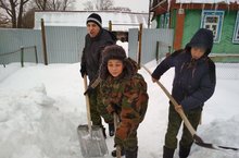 Тимуровская работа 27.01.2018 Наши взводы раз в неделю посещают своих подшевных. Взвод 9а класса усердно работают во дворе пожилого пенсионера.