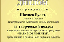 Кадеты нашей школы участвовали на районном конкурсе рисунков на тему "Парк моей мечты". Шахиев Булат завоевал диплом победителя.