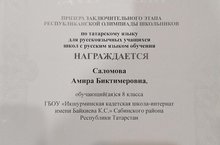 6 февраля прошла Республиканская олимпиада по татарскому языку для русскоязычных учащихся школ с русским языком обучения. Саломова Амира Биктимеровна стала призёром данной олимпиады. Поздравляем!!! Учитель Шарифуллина Кадрия Фанилевна.