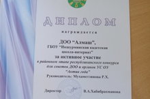 Диплом ДОО "Алмаш" 15.04.2019 ДОО "Алмаш" школы была награждена за активное участие в районном этапе республиканского конкурса для советов ДОО и органов УС ОУ "Актив года". Руководитель - Маухаметзянова Р.Х.