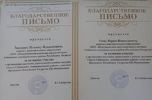 Благодарственное письмо 17.04.2019 Руководитель кружка "Авиамоделирование " Усов Юрий Николаевич и учитель технологии Хасанов Ильнат Илшатович были награждены благодарственными письмами за организацию выставки в рамках заседания Совета Сабинского муниципального района с участием Президента РТ Р.Н. Минниханова.