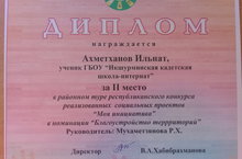 Ученик 10 класса Ахметханов Ильнат награжден дипломом 2 степени в районном туре республиканского конкурса реализованных социальных проектов "Моя инициатива" в номинации "Благоустройство территорий". Руководитель- Мухаметзянова Р.Х.