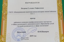 Призер районного конкурса "Лучший руководитель в сфере воспитания" 24.04.2019 Заместитель директора по ВР Гульшат Рафаилевна Петрова участвовала в конкурсе среди руководителей в сфере воспитания Сабинского муниципального района и стала призером. Мы поздравляем и желаем ей дальнейших успехов!