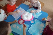 Один из самых любимых забав детворы - игра в снежки. Воспитанники младшей разновозрастной группы с огромным удовольствием нарисовали большие и маленькие снежки во время ОД по рисованию.