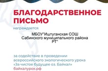 Наша школа приняла участие во всероссийском экологическом уроке «За чистое будущее оз. Байкал» и награждена Благодарственным письмом. Озеро Байкал является всемирным природным наследием «Юнеско». На уроке учащиеся познакомились с уникальными особенностями необычного творения природы, узнали об основных проблемах озера Байкал и исследовали практические способы их решения.