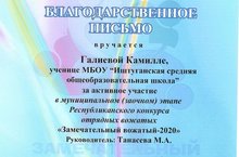 В целях активизации деятельности отрядных вожатых из числа обучающихся и создания условий для их самореализации в качестве лидеров первичных коллективов детских общественных организаций и объединений прошёл районный этап республиканского конкурса отрядных вожатых «Замечательный вожатый – 2020». Из нашей школы приняла участие ученица 8 класса, вожатый отряда «Звёздочки», Галиева Камилла. Она награждена Благодарственным письмом за активное участие в муниципальном (заочном) этапе Республиканского конкурса отрядных вожатых.