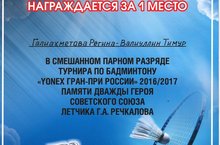 В первых числах мая в г.Екатеринбург прошёл турнир по бадминтону в память дважды героя Советского Союза лётчика Г.А.Речкалова, на данном состязании активное участие приняла наша ученица Галиахметова Регина и заняла 1 место в смешанном парном разряде. Поздравляем Регину и желаем ей достижения новых спортивных высот!