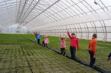 Экскурсовод питомника показала детям саженцы голубой ели.