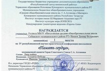 Ученик 8 класса Иванов Данияр принял участие в номинации "Солдаты Победы" с исследовательской работой и занял 1 место (руководитель Иванова Э. Х.) -
