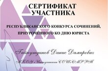 В рамках проекта «Правосудие: от А до Я» Управлением Судебного департамента в Республике Татарстан был проведен ежегодный конкурс сочинений, приуроченный ко Дню юриста среди учащихся 9-11 классов общеобразовательных организаций и I, II курсов техникумов Республики Татарстан. Ученик 10 класса Гайнутдинов Данис принял участие в данном конкурсе (руководитель Иванова Э. Х.)