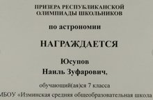 7нче сыйныф укучысы Йосыпов Наиль астрономия фәненнән республика олимпиадасында призер булды (укытучысы Йосыпов З.З.). Чын күңелдән котлыйбыз, алга таба да уңышлар телибез.