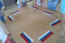 Сегодня мы с детьми старшей группы провели День Российского Флага, беседовали на эту тему. Потом дети из разноцветных ленточек сделали аппликацию и на прогулке рисовали флаг.