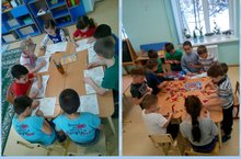Бүген кисеп - ябыштыру шөгелендә уртанчылар һәм кечкенәләр төркеме балалары "Куян өе" әкияте буенча куян белән төпкенең кайрыдан һәм боздан өйләрен эшләделәр.