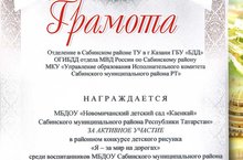 Район куләмендә үткәрелгән "Я - за мир на дорогах" конкурсында катнашкан өчен "Каенкай" балалар бакчасы Грамота белән бүләкләнде.