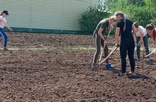 Барыбыз да өмәдә. Мәктәп яны бакчасында җир кипмәнләү, орлык чәчү, тырмалау, кумдерелгән орлыкка сулар сиптек.