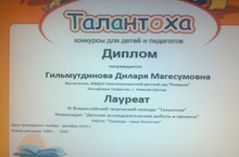 Эзләнү проект эше буенча үткәрелгән Бөтенроссия "Талантоха" конкурсында лауреат исеменә лаек булдык. Тәрбияче Гыйльметдинова Д.М. диплом белән бүләкләнде.