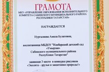 Зурлар төркемендә тәрбияләнүче Нургалиева Әмилә республикакүләм үткәрелгән "Эколяталар- табигатьнең дуслары"дигән конкурста 3нче урынны яулады. Афәрин, Әмилә!