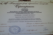PEDUSPEH – педогогик осталык бөтенроссия үзәге сайтында, мәктәпкәчә белем бирү учрежденияләре тәрбиячеләре һәм педогогларының осталыкларын ачыклау максатыннан үткәрелгән, “Современный воспитатель- 2014” бөтенроссия конкурсында безнең тәрбиячеләр дә катнашты. “Сценарий праздника” номинациясендә “Балалар дусты ул- Муса Җәлил” конкурс эше белән , Иләбәр “Умырзая ” балалар бакчасы тәрбиячесе Зарипова Дамира Данировна сертификатка ия булды.