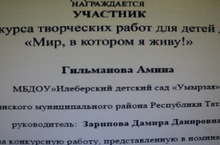 PEDUSPEH -Бөтенроссия педагогик осталык үзәге сайтында барган, мәктәпкәчә яшьтәге балаларның “Мир, в котором я живу!” III нче бөтенроссия иҗади эшләр конкурсында , Иләбәр “Умырзая” балалар бакчасында тәрбияләнүче балалар да катнашып, призлы урыннар яуладылар. “Мои любимый край” номинациясендә Гильманова Әминә, “Мои любимые животные ” номинациясендә Давлетшина Диана, тәрбиячеләре Дамира Данировна җитәкчелегендә , презентация эшләре белән катнашып , дипломнарга лаек булдылар. Котлыйбыз аларны!