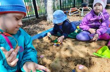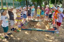 В рамках недели "Песочные фантазии" воспитанники коррекционной группы, соревнуясь друг с другом, лепили из песка разные "угощения", украшали их цветами, оставили на влажном песке отпечатки ладоней. Дети с удовольствие играли в игру "Сыщики", где находили глубоко спрятанную в песок игрушку. Игра с песком получилась очень увлекательной.