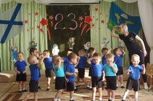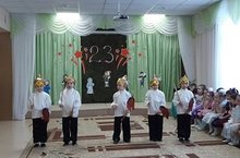 В канун праздничного дня в старшей группе прошло мероприятие, посвященное 23 февраля: «Нашей Армии сыны нынче прославляются!». Дети с любовью, нежностью и гордостью читали стихи о защитниках Отечества, о своих папах, которые проходили службу в Вооруженных силах России, а сейчас защищают и оберегают свою семью. Воспитанники станцевали танец «Салют», мальчики соревновались с богатырями силой в игре «Перетягивание на пятках», узнали о солдатской каше и провели аттракцион «Узнай крупу на ощупь. Также провели конкурсы на смекалку, эстафету на быстроту и ловкость, где собирали "снаряды". В заключении праздника дети спели песню «Армия Российская» и вручили подарки, сделанные своими руками.