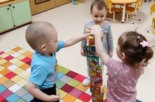 Сегодня в ясельной группе дети играли со строительным конструктором, строили башню из кубиков. Такие игры создают положительный эмоциональный климат в группе, развивают творческие способности детей.