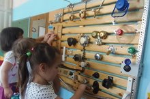 Когда малыш вырастает, он все активнее начинает интересоваться взрослым миром-его интересуют выключатели и розетки, всевозможные кнопки и телефоны, защелки и замочки. Однако в пределах кватиры все эти вещи часто представляют опасность - получается, что мы раз за разом будем запрещать малышу узнавать мир, ограничивая его пространство определенной территорией. Но тяга к знанию у ребенка столь велика, что он снова будет пытаться нарушить ваши запреты. И бороться с этим бесполезно-лучше узаконить то, что нельзя запретить.Во 2 младшей группе сделали такую развивающую доску, которая помогает развивать мелкую моторику, логику, будет стимулировать развитие новых тактильных ощущений и мыслительный процесс.