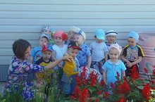 Дети младших групп очень любят рассматривать прекрасные цветы на участке нашего детского сада. Наблюдая за цветником, они учатся видеть красоту вокруг, какие они красивые, пышные, как они вкусно пахнут; разбирают их строения, цвета – закрепляя, таким образом, названия основных цветов; учатся быть бережливыми по отношению к ним.