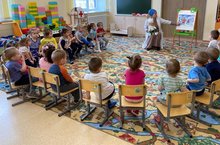 Балаларны зурлар белән аралашуга өйрәтүдә, сөйләм телен үстерүдә, җәмгыятьтә үз-үзеңне тота белеп актив һәм сәләтле кеше булып үсүендә сәхнәләштерү эшчәнлегенең әһәмияте бик зур. Бүген уртанчылар төркеме балалары ""Ачык авыз һәм "Кунакка йөрергә яратучы песи баласы" хикәяләрен сәхнәләштерделәр.Театрда катнашып, бала аралашу күнекмәләрен үзләштерә, сөйләм телен үстерә, тел байлыгы һәм иҗади активлыгын арттыра. Балалар зур кызыксыну белән үз рольләрен бик матур итеп башкардылар.
