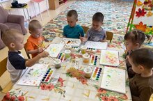 Сегодня воспитанники второй младшей группы рисовали ковёр из листьев. Ребята учились правильно держать кисть, опускать её в краску всем ворсом снимать лишнюю каплю о край баночки. Учились изображать листочки способом прикладывания ворса кисти к бумаге
