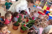 Дети первой младшей группы познакомились с комнатными растениями, со способами ухода за ними. Внимательно рассматривали совместно с воспитателем строение цветов, учили различать части (листья, стебель, цветы) и называть их. Развивалась внимание, речь, память бережное отношение к растениям.