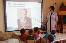 55 ел элек, 12 апрель 1961 елда, Юрий Алексеевич Гагарин “Восток” корабле белән, беренче тапкыр җир тирәли космоска очты. Әлеге очыш безнең илебез өчен бик зур горурлык булды! Гагаринның үз тавышы белән сөйләгән пластинкасын, аның очып кайтканнан соң биргән интервьюлары белән – озак еллар физика фәненнән укыткан Гөлзар Госмановна таныштырды. Ул балаларга Юрий Алексеевич тормышын сөйләде, газета – журналларда басылган рәсемнәрен күрсәтте. Балалар үзләре дә җавапсыз калмады, укытучы апаларына сораулар бирделәр. Бакчабызга йөрүче балаларыбыз өчен әлеге очрашу эчтәлекле булды.