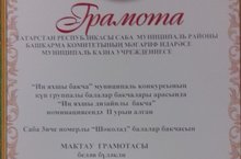 Саба мәдәният йортында узган "Укытучылар бәйрәме"ндә, безнең "Шоколад" балалар бакчасы коллективы, "Иң яхшы бакча" муниципаль конкурсының күп группалы балалар бакчалары арасында, "Иң яхшы дизайнлы бакча" номинациясендә II урын алуы белән бүләкләнде! Коллективыбызга чын күңелебездән рәхмәтебезне җиткерәбез, киләчәктә дә уңышлар теләп калабыз!