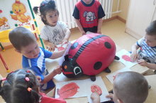 Сегодня 28.05.2015 года в первой младшей группе проводилось занятие по изобразительной деятельности. Ребята помогли найти "Божье коровке" много друзей. Цель занятия: воспитывать у детей интерес к окружающему, бережное отношение к природе.Развивать сюжетно-игровой замысел. Учить самостоятельно завершить выполненную композицию, изображать жучков,используя красную и черную краску. Много красивых "Божьих коровок" получилось.Рисунки ребятам очень понравились.