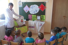 Халкыбызның гамәли сәнгате,милли киемнәре нинди генә сынаулар кичерсә дә,гасырлар дәвамында сакланып кала алган.Һәр милләтнең сәнгате,гореф-гадәте аның тарихына,диненә,табигый шартларына,сәүдә бәйләнеше һәм күршелек мөнәсәбәтләренә бәйләнгән.Бүген беренче кечкенәләр төркемендә тәрбияләнүче балалар “Халкыбызның милли бизәкләре” темасына әнгәмә оештырдылар.Балалар әлек-әлектән оста куллы хатын кызларыбызның,әбиләребезнең мавыктыргыч кул әшләре,бизәнү әйберләре белән таныштылар.Кул эшләренен бизәлеше ясалышы ягыннан кайбер керешмә чигелешләр татар каллиграфиясенә охшаш булуын балаларга җиткерделәр.Буыннан буынга күчә килгән бизәкләрнең мәгънәләре югалса да,аларның матурлыгы бүгенге көнгә кадәр саклана.Алар үзләренең күңелгә ятышлы матур төсләре белән бүген дә, көнкүрешебезне бизәп торалар.