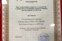 22 декабря 2020 года в г. Казани Министерство спорта Республики Татарстан провёл торжественное награждение победителей в республиканском конкурсе "Рейтинг среди СШОР, СШ и ДЮСШ Республики Татарстан за 2019 год". Наша спортивная школа "Сабантуй" награждена дипломом за 2 место. Эти достижения - плод совместного труда нашего коллектива.