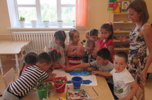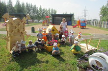 Икенче иң кечкенәләр төркеме балалары бик яратып саф һавада уйныйлар. Бүген алар тәрбияче Исламова Раилә Раилевна белән урамга чыгып комлыкта төрле фигуралар ясадылар. Башка бармак уеннары кебек үк, ком белән уйнау сабыйның вак моторика үсешенә ярдәм итә.
