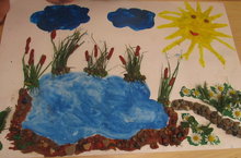 Атна дәвамында «Экологик проектлар» (танып - белу, экологик үсеш өлкәсе) эшләү максатыннан һәм «Матурлык - тирә-юньдә» (эстетик үсеш) кысаларында балалар табигый материаллардан рәсемнәр, кул эшләре ясадылар. Мәсәлән бүген, уртанчылар-зурлар төркеме балалары саф һавада уен вакытында чәчәкләр, үләннәр, төрле матур ташлар һәм ком җыеп алып керделәр һәм шул табигый материаллардан "Күл буенда" дип исемләнгән панно ясадылар.