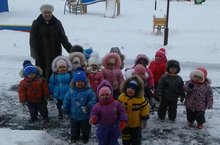 Фотода беренче кечкенәләр төркеме саф һавада. Тәрбиячеләре Хуснуллина Миләүшә Адгамовна