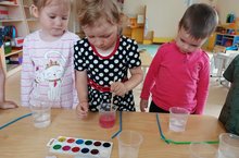 Элеге атна "Тылсымлы атна" дип аталды. Шул уңайдан, зурлар төркеме белән су, уксус һәм төсле акбур кушып тәҗрибә ясадык. Балаларга экспериментагы үзгәрешләр бик ошады. Суга салынган акбур белән уксустагы акбур төрлечә тизлектә эрүенә, реакциягә килүе балаларны бик гаҗәпләндерде.
