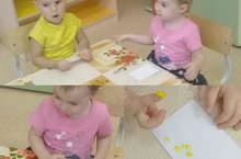 Беренче кечкенәләр төркемендә үткәрелгән шөгыльләр барысы да өйрәнү максаты белән үтә.Чираттагысы бүген,ягъни 9 октябрьдә,булды.Рәсем шөгылендә балалар яфраклар тотып биеделәр.Бөтерелә-бөтерелә очып җиргә чүгәләделәр.”Яфрак”,”сабак” сүзләрен әйтергә өйрәнделәр.Тәрәзәдән җил белән уйнап очып йөрүче яфракларны күзәттеләр.Соңрак урыннарына утырып биткә “әби бармаклар”ы белән коелган яфраклар ясадылар.Балаларга кәгазь битенә сары, кызыл төсләр белән эзләр төшерү бик ошады.