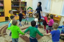 Икенче кечкенәләр төркеме балалары Ильмира Мукминовна белән“Ак калач” лы уйныйлар.Максат: балаларның сүз байлыгын үстерү, тар, киң, биек,тәбәнәк төшенчәләрен ныгыту, бер-берләренә карата хөрмәт, татар халык уеннарына карата мәхәббәт тәрбияләү.