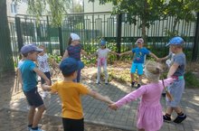 Лето - идеальное время для подвижных игр. Старшая группа играет в русскую народную игру "Заря-заряница". Цель игры: формировать умение действовать по сигналу, ориентироваться в пространстве; развивать ловкость, внимание, умение двигаться в разных направлениях
