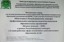 16 января на базе государственного автономного образовательного учреждения Центр психолого-педагогической реабилитации и коррекции «Росток» состоялся семинар по подготовке к республиканскому конкурсу профессионального мастерства педагогов-психологов образовательных организаций «Педагог-психолог - 2020». В рамках семинара выступили победители конкурса «Педагог-психолог – 2019», которые поделились своим опытом и дали рекомендации будущим участникам. В работе семинара приняла участие наша коллега - педагог-психолог Гайнуллина З.Р., которая будет участвовать в зональном этапе данного конкурса в этом году. Желаем ей успехов и вдохновения.