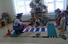 Образовательная деятельность в 1 младшей группе(воспитатель Галиева А.Р.) была посвящена знакомству с дорожными знаками и правилами поведения на дороге. Воспитатель в роли постового обучал юных водителей и пешеходов безопасности :