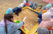 Сегодняшнее занятие по ознакомлению детей 1 младшей группы с особенностями песка прошло на участке под открытым небом. Малыши узнали, что сухой песок сыпучий и из него ничего невозможно слепить, а из мокрого песка легко получаются куличики. Также дети повторили правила игры в песочнице и решили остаться там играть после занятия.