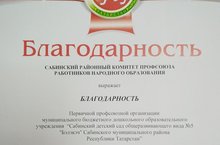 Первичная профсоюзная организация МБДОУ "Сабинский детский сад №5 "Бэлэкэч" была награждена Сабинским районным комитетом профсоюза работников народного образования благодарностью за активное участие во "Всероссийской эстафете здоровья".