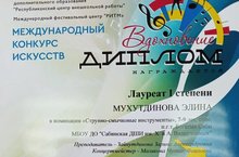 В марте в г.Казани в заочной форме прошел Международный конкурс искусств «Вдохновение», где приняла участие ученица музыкального отделения класса скрипки Мухутдинова Элина. По итогам конкурса в номинации «струнно-смычкое инструменты» наша ученица стала обладателем диплома Лауреата 1 степени. Поздравляем Элину и ее руководителя Зайнутдинову Зарину Александровну, концертмейстера Маликову Чулпан Фаиловну с победой! Желаем дальнейших творческих свершений!