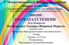 По результатам конкурса "Парад талантов" 04.04.2026 в пгт. Балтаси, в номинации инструментальное исполнительство Лауреатом l степени стал Дуэт гитаристов Нечипоренко Эльвира и Шарипов Марсель, Лауреатом lll степени - Ансамбль гитаристов ( Ильин Адель, Закирова Рамиля, Шигапов Кирилл), Нечипоренко Эльвира - диплом l степени.