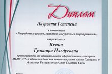 В марте 2025г. на базе МАУДО "ДШИ N13" г.Н.Челны проходил республиканский конкурс методических пособий педагогов дополнительного образования художественной направленности. Учредителем является ФГБОУ ВО "КазГИК". В номинации "Разработка уроков, занятий, внеурочных пособий" преподаватель Сабинской ДШИ Яхина Гульнара Ильдусовна удостоена Диплома Лауреата I степени.